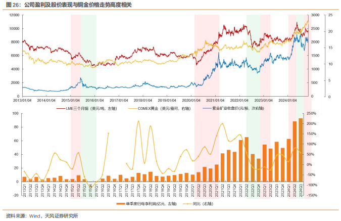 作为典型的铜金双主业公司,公司股价表现及盈利和铜金价格高度相关。展望后市,我们认为在前期资本开支不足和资源贫化的条件下,铜精矿供应端硬约束已塑造,叠加新一轮降息周期开启,中长期铜价中枢有望稳步上行,同时特朗普新任期二次通胀逻辑或将在未来四年持续演绎,新旧范式共同支撑金价走牛。铜金步入上行周期,或将对公司盈利和股价形成有效支撑,叠加发展目标明确及α能力突出,公司有望迎戴维斯双击。