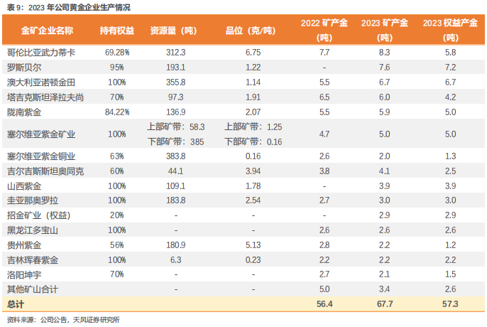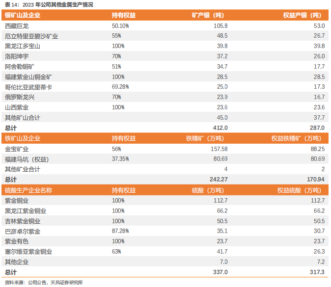 3)陇南紫金金山金矿:2023年陇南紫金产金5.9吨,新建的金山金矿2,000吨/日采选工程已建成并取得安全设施设计审查批复,目前已进入试生产阶段。