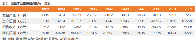 初创十年间,紫金矿业保持超高速增长。从1993年至2002年的10年间,紫金矿业累计生产黄金22.12吨,实现销售收入18.05亿元,利润总额5.03亿元,CAGR分别达到81.97%、69.10%和86.30%。其中2002年,在平均入选品位仅0.92g/t的情况下,生产黄金0.73吨,实现销售收入5.93亿元,利润总额2.04亿元。