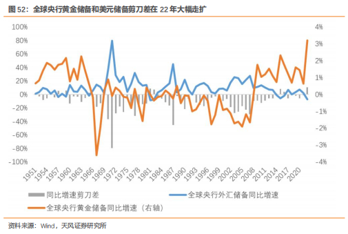 22年后利率框架的阶段性失效或因央行购金行为增强。俄乌冲突爆发后,美国与西方世界冻结俄罗斯央行美元外汇储备,导致非美经济体国家对美元安全性产生质疑。地缘政治环境变化背景下,多国开始加大力度增加黄金、特别提款权等储备资产,推动外汇储备资产多元化,最终表现为2022年以来全球央行购金量显著增加。外汇储备下降在美联储加息周期内并不少见,但2022年下降的速率是创记录的,全球央行外汇储备较2021年底同比下降了7%,创下1982年以来的新低;而黄金储备全年则同比增加了11%,创有数据统计以来的新高。