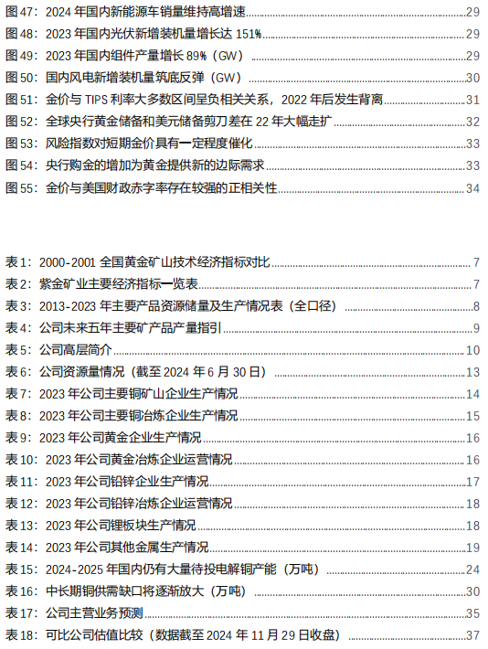 三十年深耕矿业,紫金矿业蜕变成为全球大型综合性矿业集团。紫金矿业前身为1986年成立的上杭县矿产公司,1993年,因启动紫金山金矿开发,公司更名为“上杭县紫金矿业总公司”,由此开启了“紫金矿业”元年。30年来,紫金矿业已由县属小企业蜕变成世界500强、全球知名的大型跨国矿业集团。目前,紫金矿业在国内17个省(区)和海外15个国家拥有重要矿业投资项目,已经成为中国铜、金、锌资源储量最大、产量最多、综合效益最好的金属矿业企业。截至24H1,公司拥有权益资源量:铜8075万吨、金3051万吨、铅(锌)1045万吨、碳酸锂当量(LCE)1347万吨、银1.81万吨、钼341万吨。产量方面:2023年公司实现矿产铜100.7万吨,成为中国唯一矿产铜产量破百万的企业,相当于2023年中国矿产铜总产量的62%;矿产金产量67.7吨,黄金资源量及产能位居主要上市矿企中国及亚洲第一、全球前十,相当于2023年中国矿产金总产量的23%左右。