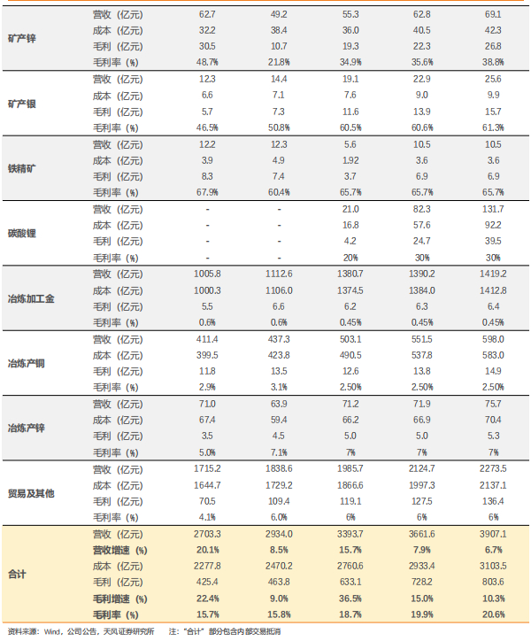 -贸易及其他:其他业务主要包括冶炼银、铜管、铜板带、铅精矿、钼精矿、黄金制品等,另其他产品、中间业务、服务业务等,假设24-26年贸易及其他业务营收增速分别为8%/7%/7%,毛利率稳定在6%。