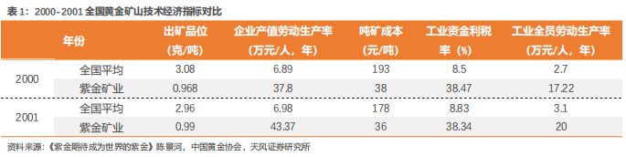 紫金山金矿在投资&成本控制优势显著。根据陈景河先生2003年发表的《紫金期待成为世界的紫金》,基建投资方面,当时国内黄金行业建设成本平均1.5-2亿元/吨,而紫金山金矿在日采选规模达4.0万吨以上、实现9吨产金量的情况下,基建投资仅5-6亿元,投资控制尤为显著。人力成本方面,公司通过新技术和装备提升劳动生产率,当时员工工资占销售收入的4-5%,远低于行业20%以上的平均水平。公司还通过市场化运作,如引进专业工程队节约设备投资,招投标降低采剥成本,使2002年吨矿石综合成本降至36.72元,远低于全国平均水平。