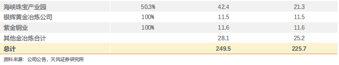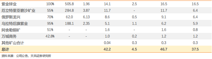 5)海域金矿:12,000吨/日采选工程有序推进,计划2025年投产,整体投产达产后年矿产黄金约15-20吨,公司持有海域金矿实际权益约44%(含招金矿业20%权益)。