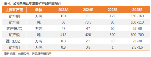 资源为王,深耕矿业30余年,公司已拥有铜、金、锂、钼等世界级多元矿业资产组合。截至24H1,公司拥有权益资源量:铜8075万吨、金3051万吨、铅(锌)1045万吨、碳酸锂当量(LCE)1347万吨、银1.81万吨、钼341万吨。主力矿种铜、金资源量及产能位居中国领先、全球前十,据公司最新五年规划,到2028年矿产铜产量将达到150-160万吨,金产量将达到100-110吨,我们取中值测算得公司23-28年矿产铜/金产量复合增速分别为8.9%/9.1%,铜金主业将持续进阶。潜力矿种方面,依托公司自主技术和工程能力优势,未来五年有望跻身全球最重要的锂、钼、银生产商行列。