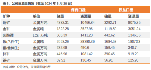资源为王,紫金矿业拥有铜、金、锂、钼等世界级多元矿业资产组合。目前,紫金矿业在国内17个省(区)和海外15个国家拥有重要矿业投资项目,已经成为中国铜、金、锌资源储量最大、产量最多、综合效益最好的金属矿业企业。截至2024年6月底,公司拥有权益资源量:铜8075万吨、金3051万吨、铅(锌)1045万吨、碳酸锂当量(LCE)1347万吨、银1.81万吨、钼341万吨。主力矿种铜、金资源量及产能位居中国领先、全球前十,潜力矿种方面,依托公司自主技术和工程能力优势,未来五年有望跻身全球最重要的锂、钼、银生产商行列。