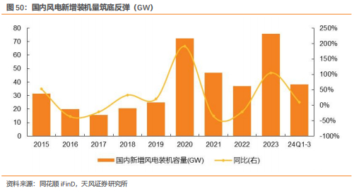 2023年,风电增长筑底反弹,新增装机容量75.7GW,同比+101%。2024年前三季度,国内风电新增装机容量38.2GW,同比+10%。十四五为风电发展的关键时期,随着大基地项目加快建设,风电新增装机有望保持快速增长。按2024年国内新增风电装机容量75GW,陆上风电和海上风电新增装机分别为65GW和10GW测算,预计风电新增装机用铜量将达到25万吨左右,占国内铜需求比重约1.7%。