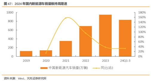 新能源车单车用铜量较高,产销高景气有效补充铜需求。新能源车用铜量高于传统汽车,电机内部大量使用电阻及铜圈,连接器、锂电铜箔和线束成为用铜增量来源,充电桩也成为助推铜需求增长的重要领域。据国际铜业协会和IDTechEx,纯电动乘用车平均单车用铜量约为83千克,达传统燃油车的3-4倍。2023年,在年初新能源补贴退坡以及燃油车降价抢占市场份额的背景下,国内新能源汽车销量944.8万辆,同比+37.5%;2024年前三季度,国内新能源汽车销量达832万辆,同比+32.5%,行业维持了较高的景气度。据有色金属工业网预测,假设2024年国内新能源汽车销量为1100万辆,则新能源汽车用铜量将达到91万吨,占铜需求比重约6.1%。