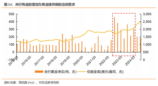 然而实际利率框架自2022年后出现一定偏差。22年下半年之后,金价与实际利率发生了大幅背离,2022年8月1日至2024年5月1日,十年期美债的实际收益率从0.1%上升至2.3%,而同期伦敦金现从1772.2美元/盎司上涨至2319.4美元/盎司,今年的3月-5月初背离尤为明显,两者反而呈现出一定的正相关性。