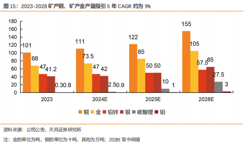 根据未来五年发展规划,公司将发挥资源优势,铜、金产量有望持续快速增长。2028年矿产铜、矿产金产量指引中值分别为155/105万吨,以中值计算,2023-2028矿产铜、矿产金产量5年CAGR有望达8.9%/9.1%,保持快速增长。