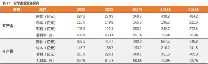 -金板块:1)量:假设24-26年矿产金销量分别为72/85/92吨,冶炼加工金销量稳定在255吨;2)价:预计金价中枢稳步抬升,假设24-26年伦敦金现分别为2350/2400/2450美元/盎司;3)利:假设24-26年矿产金单克生产成本为230元,对应毛利率分别为55.1%/55.4%/56.3%,冶炼加工金毛利率稳定在0.45%。