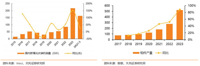 2023年在光伏电站投资经济性及环境效益提升的驱动下,全年国内光伏新增装机216GW,同比+151%;光伏组件产量523GW,同比+89%。2024年前三季度,国内光伏新增装机容量163.4GW,同比+27%,在高基数的基础上仍保持较快增速。光伏装机高增速将使铜需求快速增长,据有色金属工业网预测,2024年国内光伏新增装机容量为210GW,用铜量或将达84万吨,约占国内铜总需求量的5.6%。