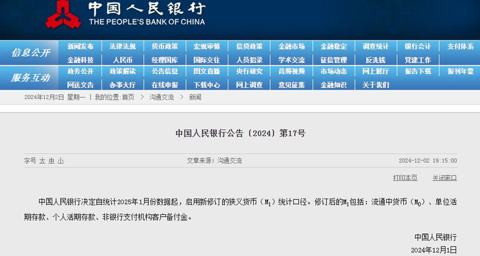 据央行网站显示,中国人民银行决定自统计2025年1月份数据起,启用新修订的狭义货币(M1)统计口径。修订后的M1包括:流通中货币(M0)、单位活期存款、个人活期存款、非银行支付机构客户备付金。中国人民银行将于2025年1月份数据起开始按修订后口径统计M1,预计将于2月上旬向社会公布。