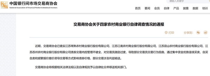 12月2日,据交易商协会公告显示,近期,交易商协会已查实江苏常熟农村商业银行、江苏江南农村商业银行、江苏昆山农村商业银行、江苏苏州农村商业银行债券交易内控管理不健全,对交易员激励过度,导致部分交易员交易行为扭曲,通过集中资金优势连续买卖、自买自卖和频繁报价撤价诱导交易等方式影响债券价格,部分交易涉及利益输送。