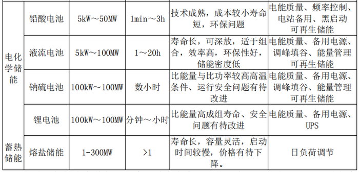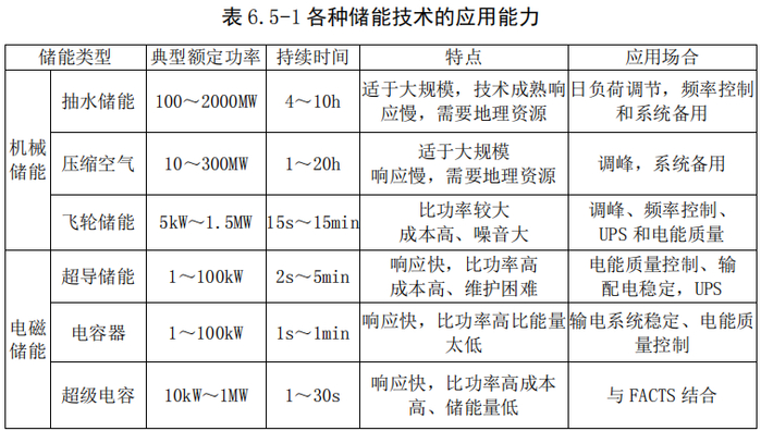 另外,对于机械储能、电磁储能、电化学储能、蓄热储能中各项储能技术特点、应用能力等,规划也进行了详细的说明,如下表所示:
