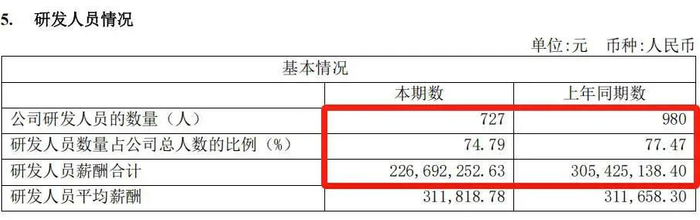 另一个争议很大的地方,这样一家非常依赖研发驱动的企业,一家要与世界AI芯片巨头PK的企业,今年上半年研发人员竟然少了。中报显示,2024年上半年,寒武纪研发人员总数727人,而上年同期980人;相当于少了253人,少了25%。