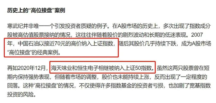 比如,有“投资者”表示,在A股市场的历史上,多次出现了指数成分股被高估值股票接纳的情况,这往往伴随着股价的剧烈波动和长期的低迷表现。2007年,中国石油以接近70元的高价调入上证指数,随后其股价几乎持续下跌,成为A股市场“高位接盘”的经典案例。