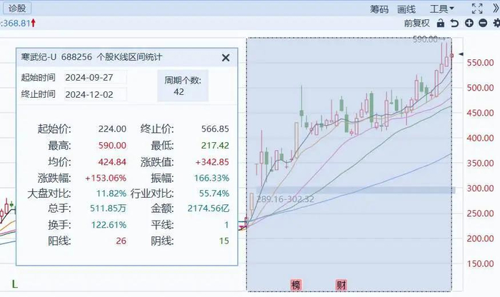 寒武纪市值的膨胀,主要源于本轮行情走势一骑绝尘。根据统计,自9月27日以来,寒武纪股价累计涨幅超过150%。短短2个多月时间,市值从934亿元上涨到2346亿元。