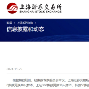 根据指数规则,经指数专家委员会审议,上海证券交易所与中证指数有限公司决定调整上证50、上证180、上证380、科创50等指数样本,于2024年12月13日收市后生效。其中上证50指数更换5只样本,上证180指数更换18只样本,上证380指数更换38只样本,科创50指数样本无变动。