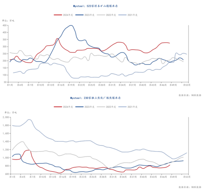 根据铁水产量来看,11月整体煤焦需求处于年内的相对高位,全月基本在235万吨左右。但是从目前炼焦煤的基本面来看,炼焦煤的供应基本可以满足240-245的铁水产量。所以由于供应端的过剩,导致焦钢采购煤的可选择性变大,下游拿货消极,压价意愿较强。而由于行情下跌,贸易商出货难度较大,拿货意愿不足。除非手持下游订单合同,才会选择进场采购,投机需求低迷。不过我们可看到,进入11月下旬之后,北方天气急剧降温,部分库存偏低的焦企开始逐步提升炼焦煤库存,需求也有一定回暖。但整体补库力度不大,难以支撑煤价企稳。