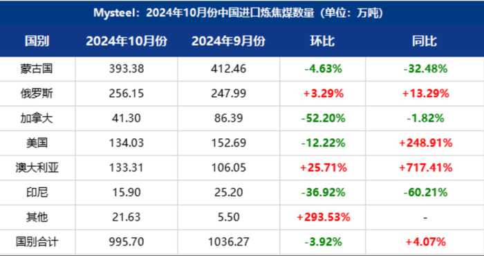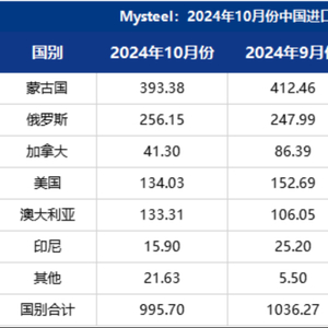 据海关总署最新数据显示,2024年10月份,中国进口炼焦煤总量达995.7万吨,环比下跌3.92%,同比下跌4.07%。整体来看,10月进口炼焦煤环比呈增幅最大的为澳大利亚,环比增长26%,减幅最大的为加拿大,环比下降52%,其余国家进口量,除俄罗斯小幅增长外,环比9月均有不同程度下滑。