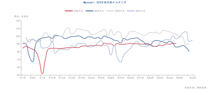 11月炼焦煤产量继续稳步增长,产量较上月同比小幅回升。我网523家炼焦煤矿山数据显示,11月29日矿山开工率为90.65%,较上月同期上升2.01%。目前国内煤矿产量在稳步回升当中,根据《2024年山西省煤炭稳产稳供工作方案》,今年山西将在确保安全生产前提下,全省煤炭产量稳定在13 亿吨左右。数据显示今年前10月山西省规上原煤累计产量为104457.8万吨,距离13亿吨的目标仍有不小差距,预计12月份山西煤炭产量不会有大幅缩减。但是考虑到12月份安全生产月,煤矿生产会较以往相对谨慎,产量预计与11月相差不大。