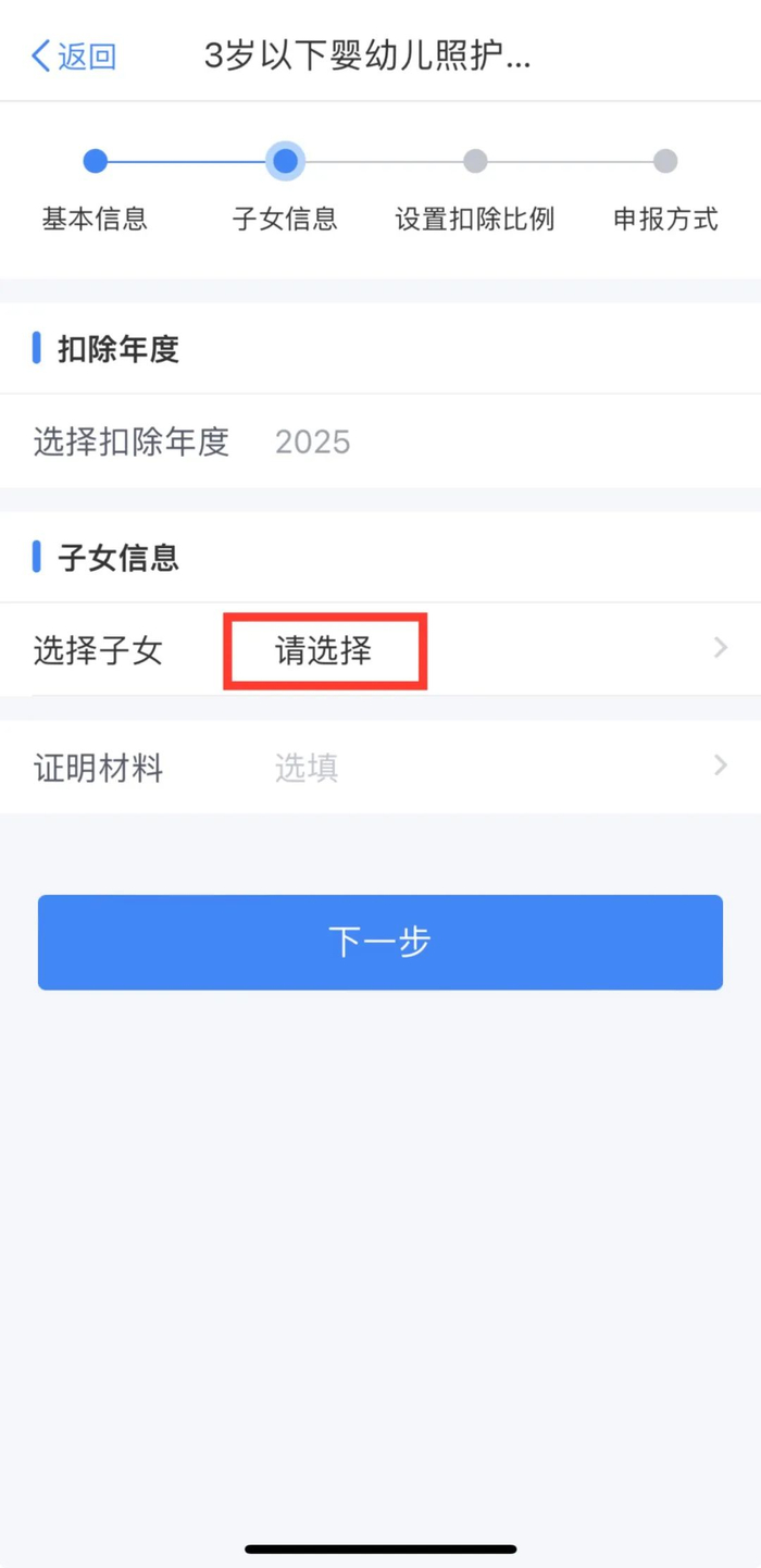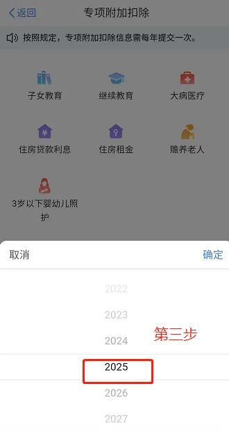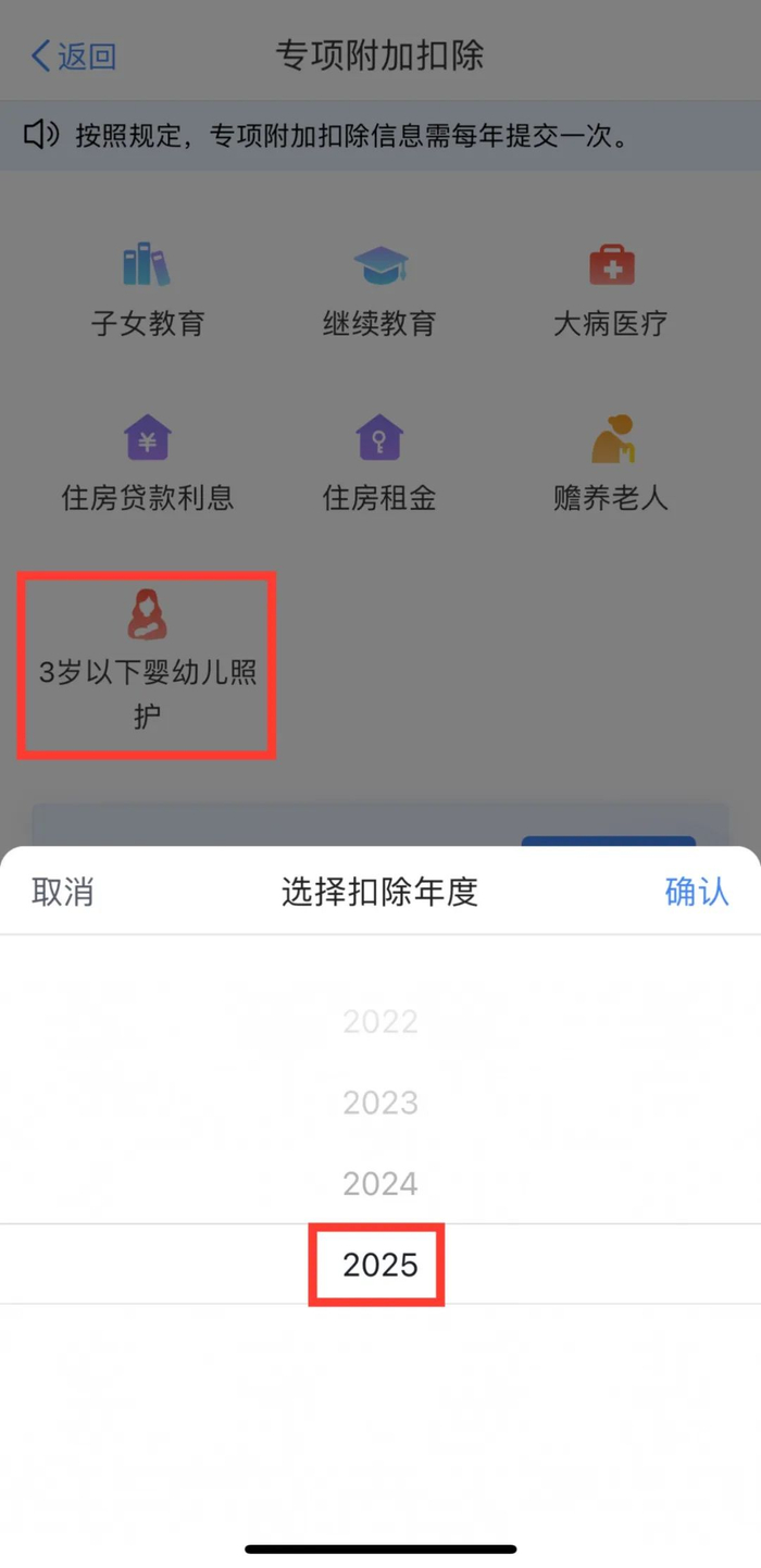 ◆打开“个人所得税”APP,注册并登录,选择【首页】→【专项附加扣除填报】→【3岁以下婴幼儿照护】→【选择扣除年度2025】→【确认】;