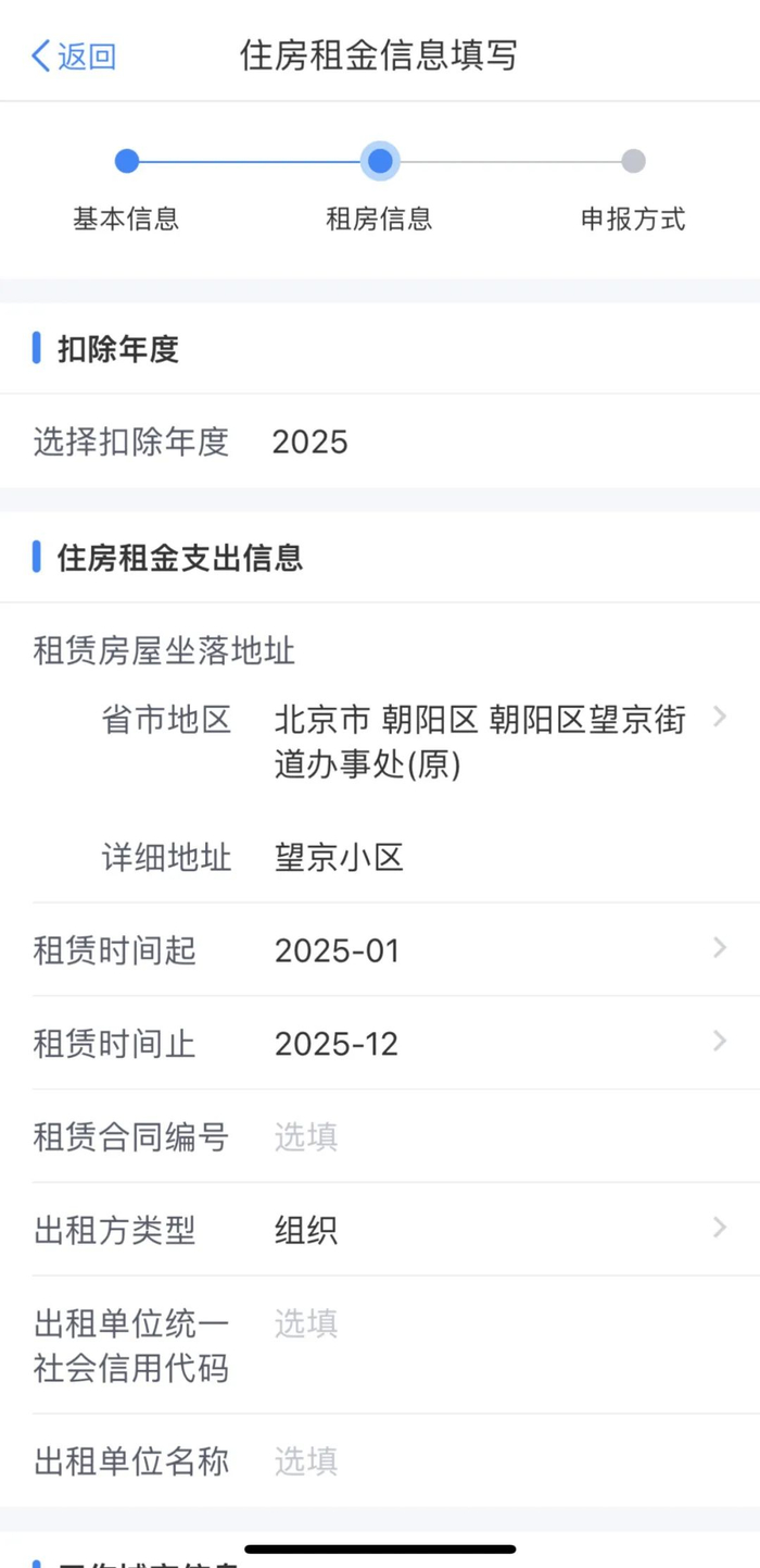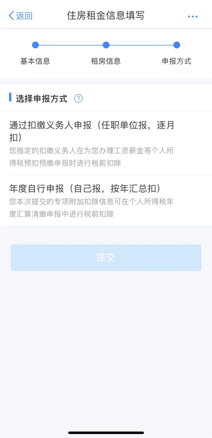 ◆填写“住房租金支出信息”和“工作城市信息”等信息后,点击“下一步”;选择“申报方式”,点击“提交”即可。
