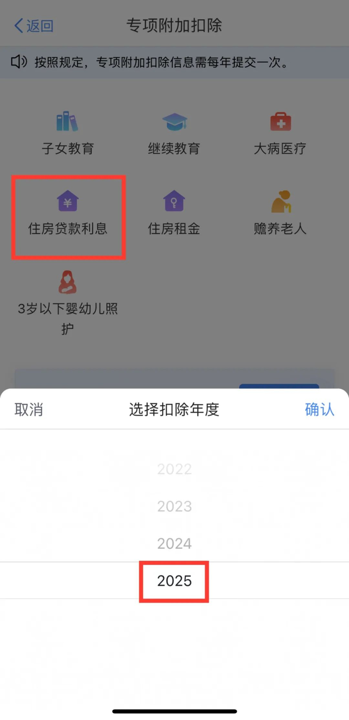 ◆打开“个人所得税”APP,注册并登录,选择【首页】→【专项附加扣除填报】→【住房贷款利息】→【选择扣除年度2025】→【确认】;