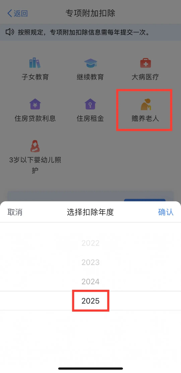◆打开“个人所得税”APP,注册并登录,选择【首页】→【专项附加扣除填报】→【赡养老人】→【选择扣除年度2025】→【确认】;