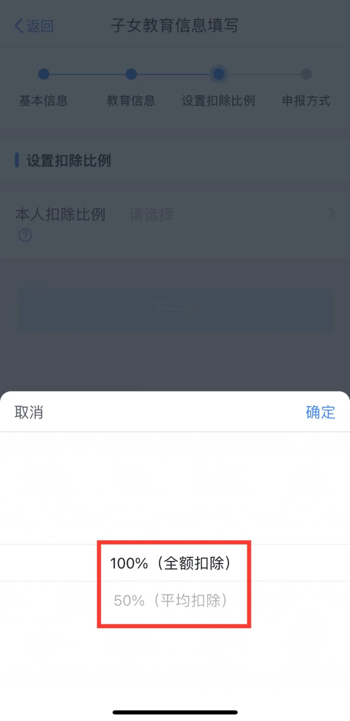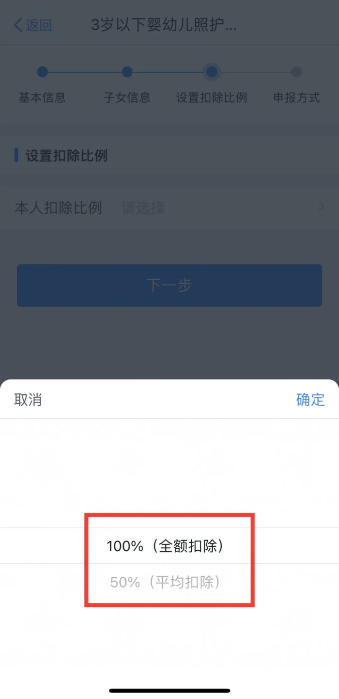 ◆填写“配偶信息”,选择“扣除比例”;