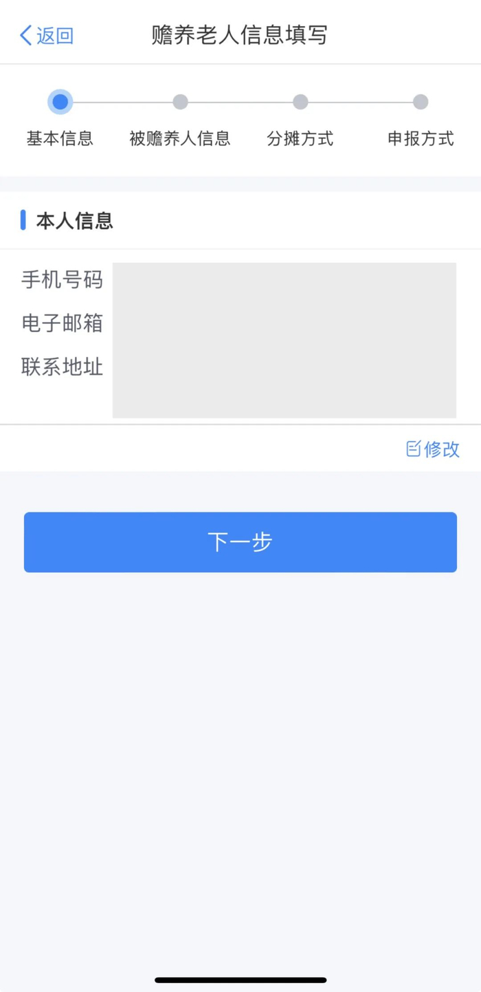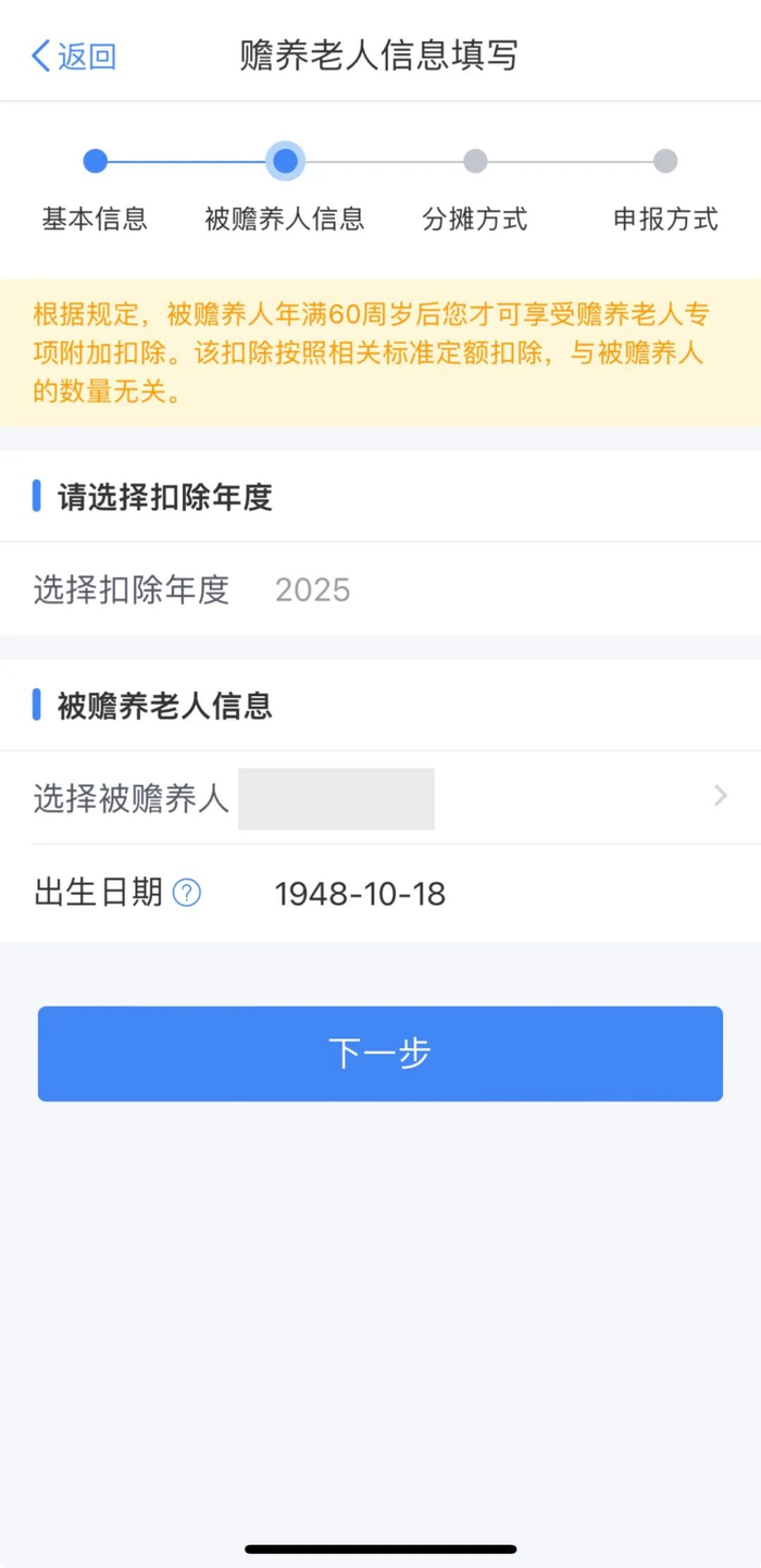 ◆点击“选择被赡养人”,填写被赡养老人信息后,点击“下一步”;