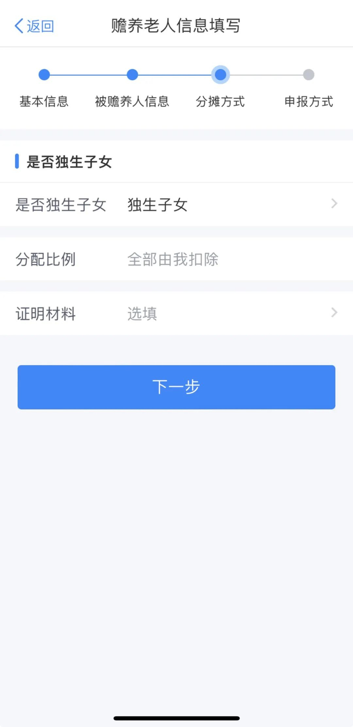 ◆填写“是否独生子女”信息,确定扣除“分配比例”或“分摊方式”后,点击“下一步”;