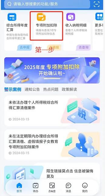 点击APP【首页】,点击【专项附加扣除填报】,新增专项附加扣除信息。详细操作步骤见本文第05至10部分内容。