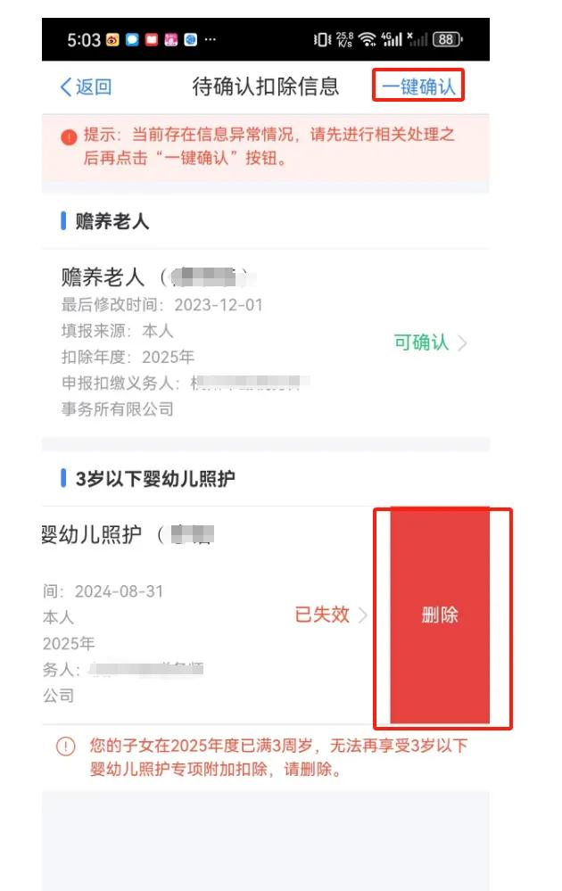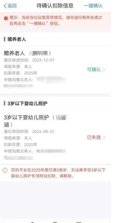 (3)打开【可确认】状态的专项附加扣除信息,核对信息;如需修改们可以点击【修改】,信息确认后点击【一键确认】。如果有【已失效】信息,则需要先删除,然后再确认。如下图: