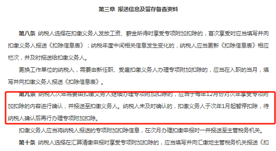 根据国家税务总局发布的关于修订《个人所得税专项附加扣除操作办法(试行)》的公告,纳税人需要每年的12月对次年的专项附加扣除信息予以确认。