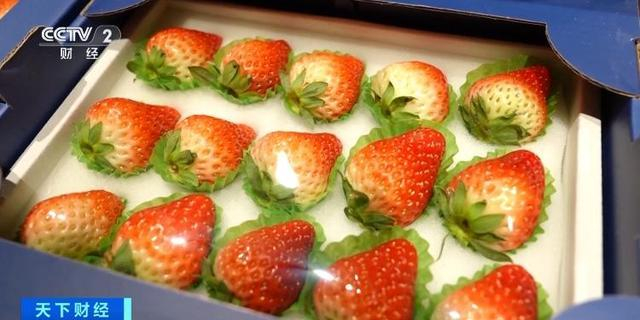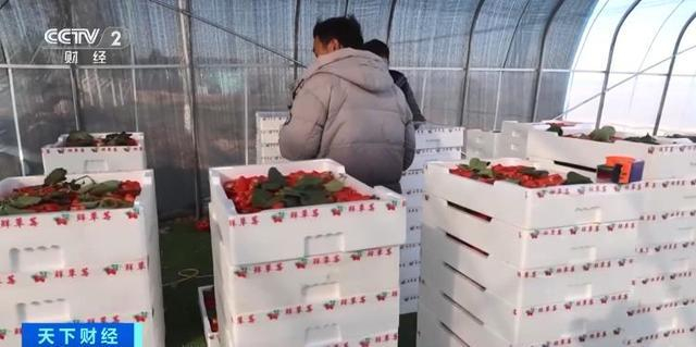 在附近的草莓收购点,一箱箱新鲜采摘的草莓经过称重,加盖保鲜膜重新包装后,立刻被装上货车发往全国各地。