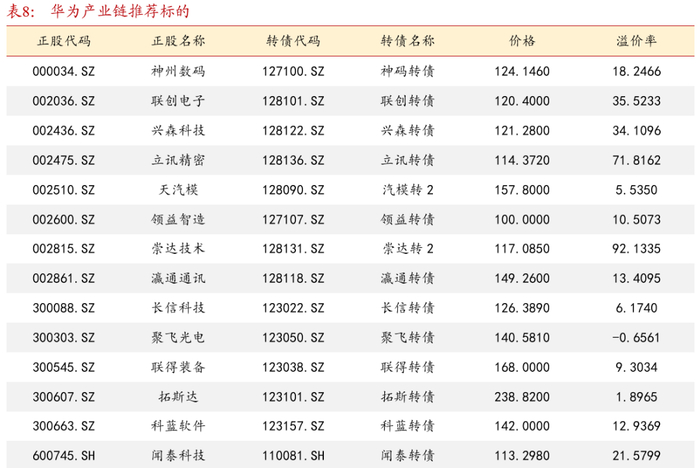 自主可控板块短期市场风险偏好提升,华为产业链具有较高弹性。在智能手机产业链订单持续边际改善、补库存拉货动力足的背景下,华为深度布局自主产业链,手机销量有望恢复高增长,华为鸿蒙、华为鲲鹏、华为海思、华为星闪等平台涉及的相关转债均值得关注。建议关注标的如下: