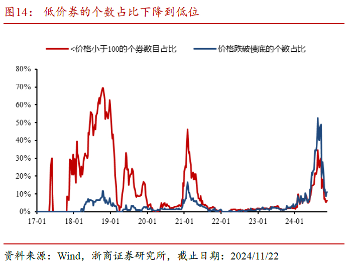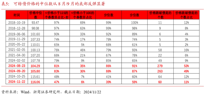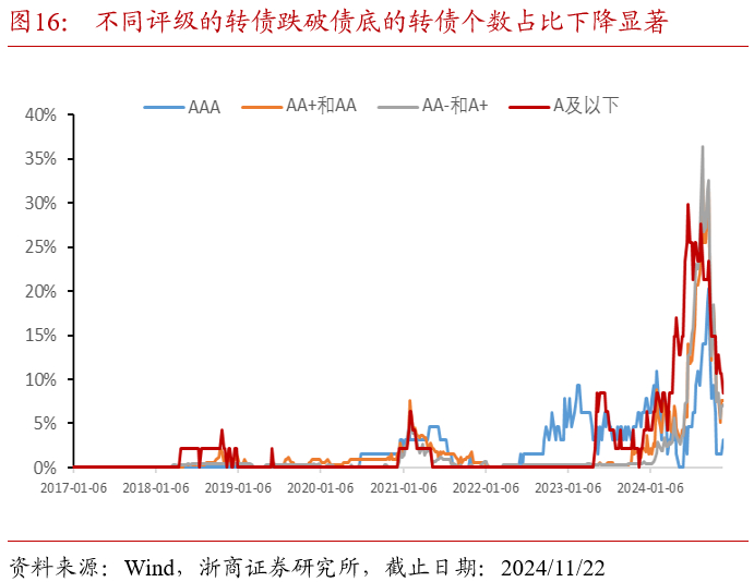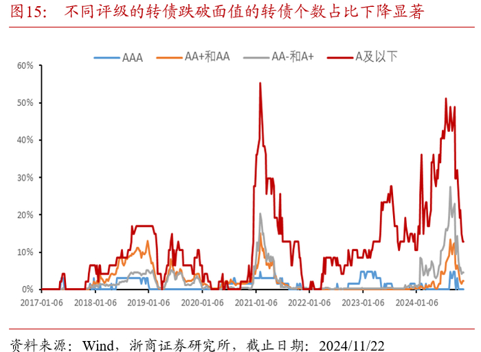 2024年可转债市场集中定价了信用风险,其中9月中旬左右,近75%的转债被定价了信用风险,且其违约概率在10%以上,从不同评级来看,9月份不管任何评级,都有较大的比率跌破债底、跌破面值的转债。而从可转债的中位数来看,大面积的跌破债底意味着可转债的价格往往处于100元以下,可转债市场的中位数价格也是大幅下跌。但截止到11月26日,市场定价的违约率大于0的转债个数占比下降到了40%以下,平均违约率也大幅下降,各类评级的转债的跌破面值、跌破债底的比率也出现了修复。