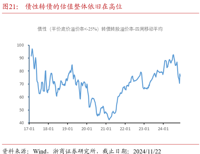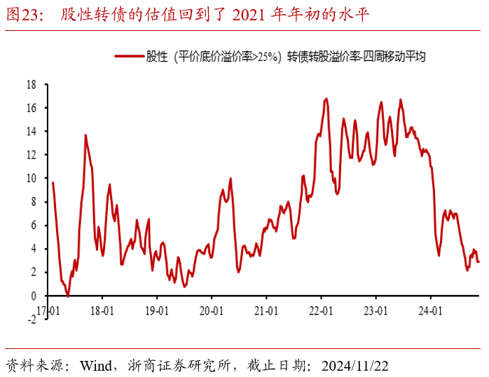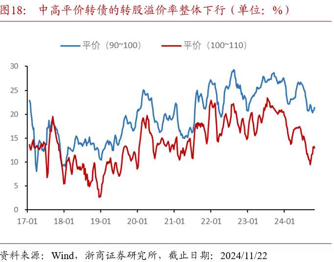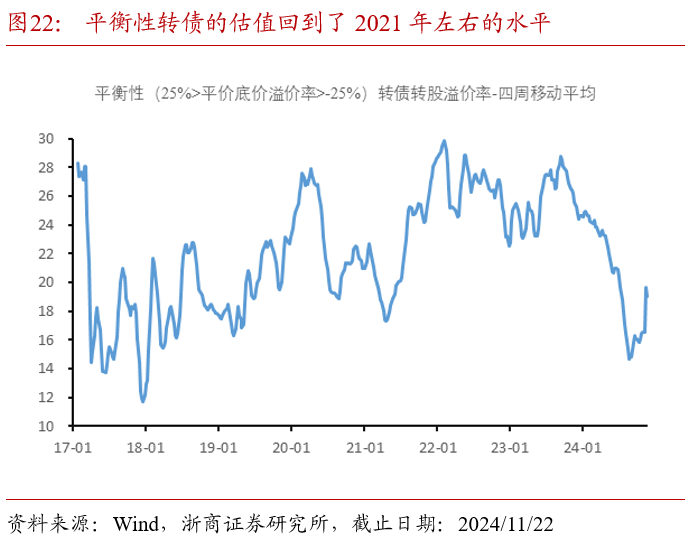 从不同性质的转债来看,平衡性转债的转股溢价率为19%左右,处在2017年以来的30%的分位数水平,而股性转债的转股溢价率为3%左右,处在2017年以来的14%的分位数水平。