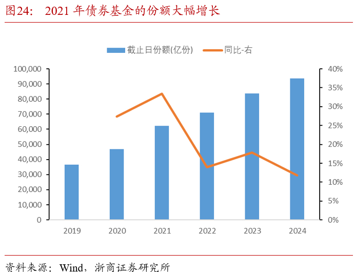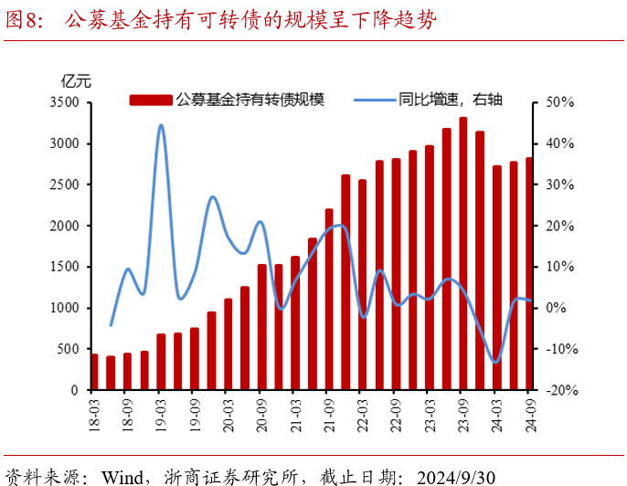 2024年可转债整体估值逐渐接近2021年之前的水平。2021年和2022年是估值显著提升的年份,而2023年和2024年则呈现压缩趋势。可转债估值提升与债券基金和固收加基金的份额增长强相关,但2023年和2024年该类基金规模整体萎缩。考虑到过去两年的业绩,预计2025年需求仍将疲弱,可转债的估值大概率维持在低位水平。