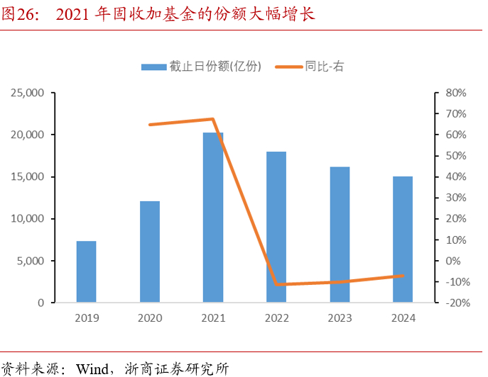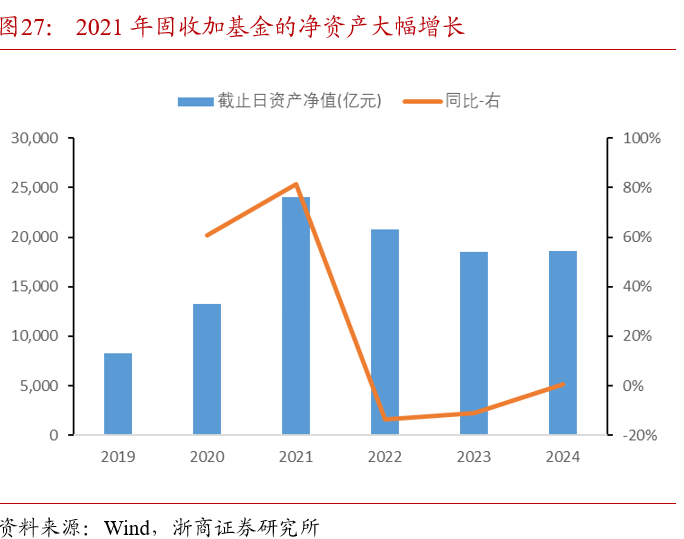 整体来看,可转债的估值越来越接近2021年之前的水平,从估值的变化趋势来看,2021年、2022年是可转债市场估值提升最为明显的年份,而2023年、2024年可转债的估值处在压缩的趋势中。2021年、2022年可转债的估值提升伴随着债券基金、固收加基金的份额与净资产大幅增长,而2023年、2024年固收加基金的规模整体是萎缩的,考虑到固收加基金在过去一年、过去两年的业绩情况,2025年需求力量预计继续疲弱,可转债的估值大概率维持在低位水平。