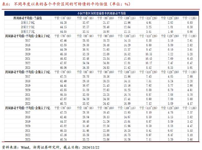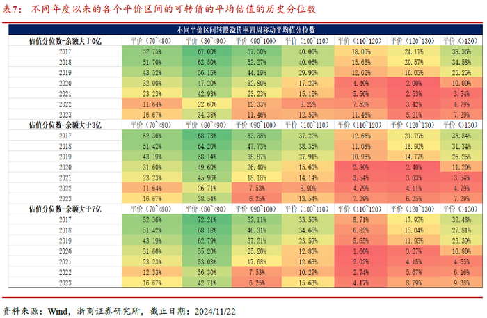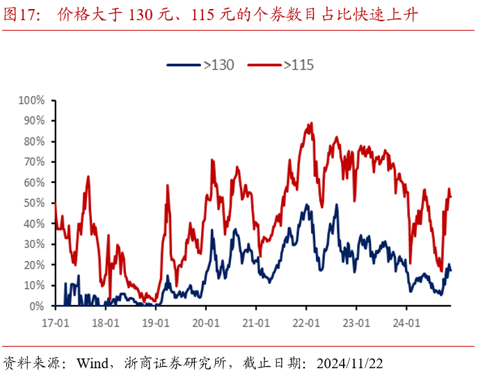从不同平价区间来看,平价处在90~110的转债当前的转股溢价率为20%左右,依旧处在2017年以来的高位,但是已经处在2021年以来的低位;平价处在100以上的转债其转股溢价率基本上处在2017年以来的低位。