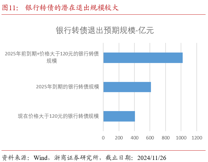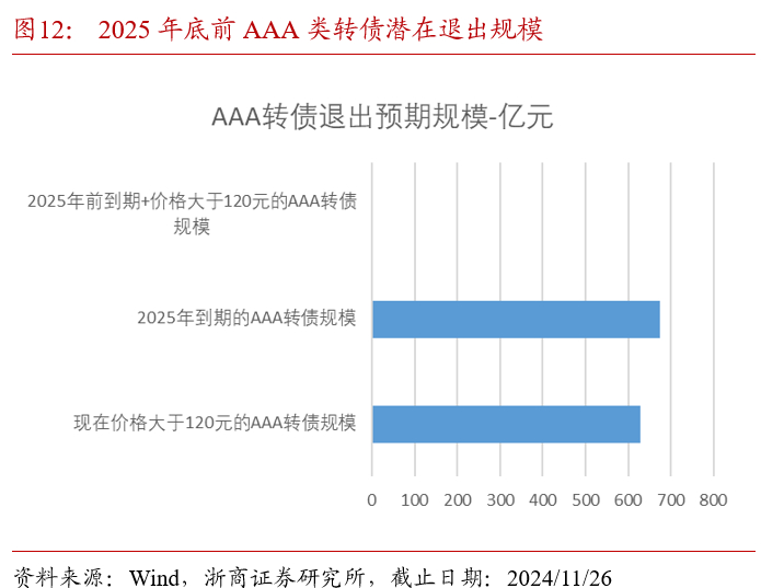 2024年可转债的余额明显的萎缩,这是自2020年以来的首次,而公募机构配置转债的绝对规模也出现了萎缩,但是相对配置占比依旧处在高位,但是相对2023年的高点也明显下降了。而2025年的可转债到期规模在800~100亿之间,其中AAA评级转债的到期规模为600~700亿之间,银行转债到期规模600亿左右,因此明年对于可转债投资者而言,AAA、银行转债等底仓转债的到期加大了配置的难度。而潜在的新发规模在700多亿左右。静态的看,2025年大概率转债依旧净减少。