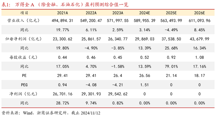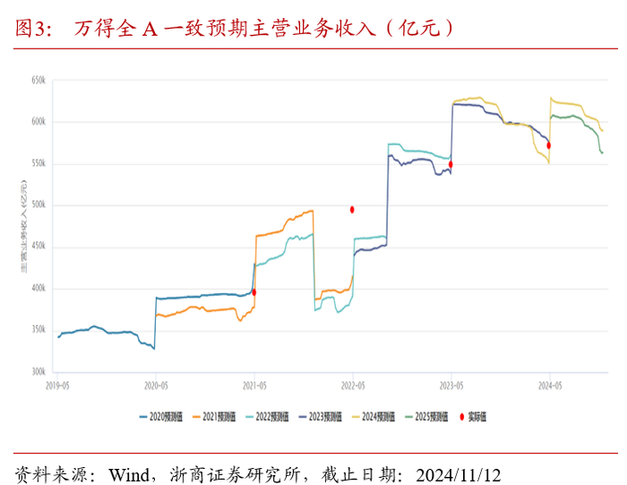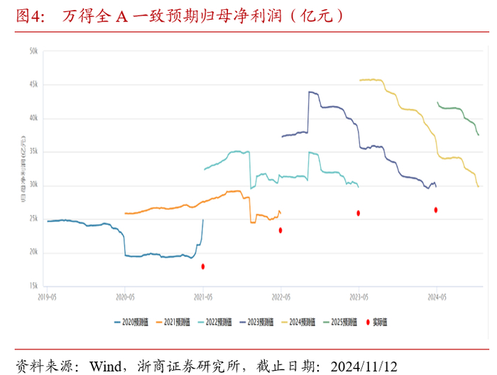 根据分析师的预期来看,目前万得全A(除金融、石油石化)的收入、利润依旧处在下修趋势中。具体来看,2025年下滑趋势明显,我们预计在2026年有望迎来反转。