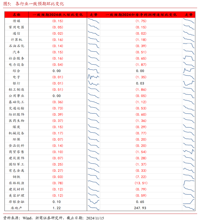 2024年大部分行业收入和盈利预期处在下修通道中。政策刺激下,仅非银和房地产板块收入、归母净利润预期上修。