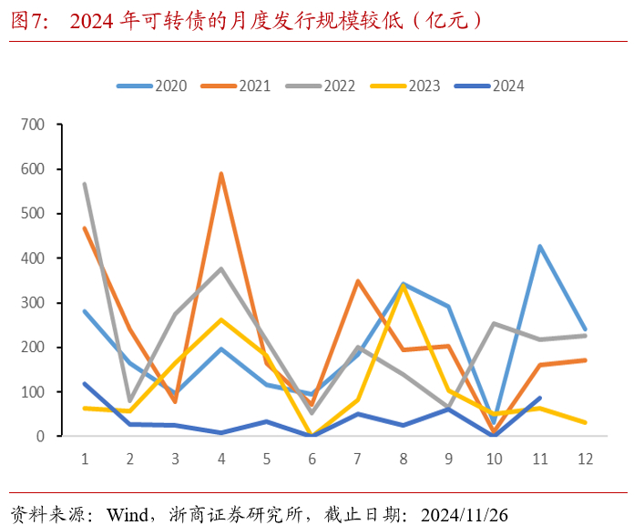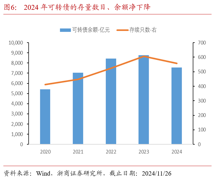 2024年可转债余额显著萎缩,为自2020年以来首次。2025年可转债到期规模预计在800~1000亿之间,其中AAA评级和银行转债的到期增加了配置难度。新发规模约700亿,供需关系仍将紧张。