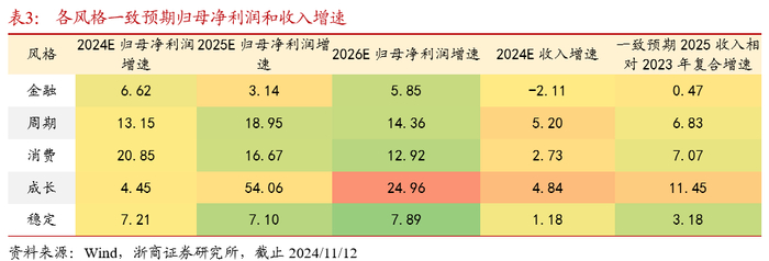 风格维度来看,成长风格的基本面增速预期依旧很高,我们预计未来两年一致预期复合增速达11.45%,大幅领先周期、消费、稳定、金融风格。