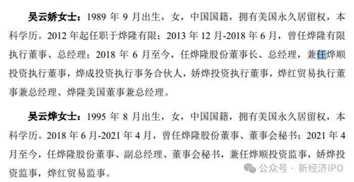 吴云娇2011年12月从美国大学毕业,两年后,即2013年12月从其父亲吴军手中接任无锡烨隆法定代表人、执行董事、总经理;吴云烨2016年底从美国大学毕业,2018年6月至2021年4月担任无锡烨隆董事、董事会秘书。