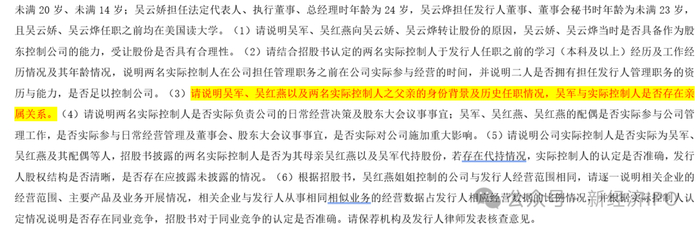 不仅如此,反馈意见要求披露吴军、吴红燕以及两名实际控制人之父亲的身份背景及历史任职情况,说明吴军与实际控制人是否存在亲属关系。
